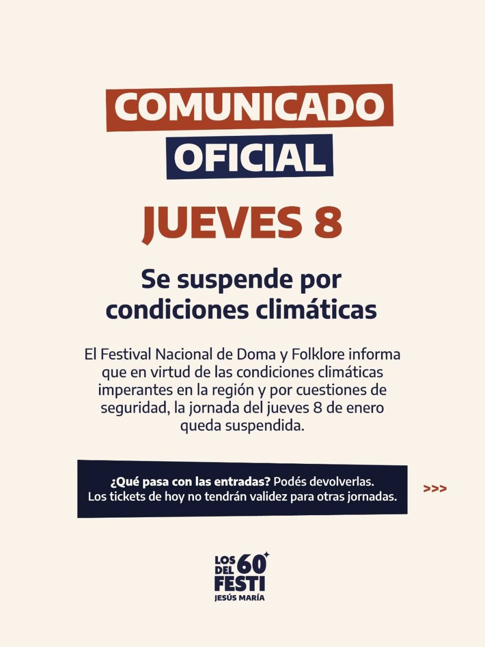 La 60ª edición del Festival Nacional de Doma y Folklore de Jesús María inició el jueves 8 de enero con suspensión de la noche inaugural por pronóstico de tormentas, según comunicó la organización. Las presentaciones previstas para ese día no se reprograman; se mantienen solo el Desfile Unión de los Pueblos y el acto inaugural, ambos trasladados al viernes.