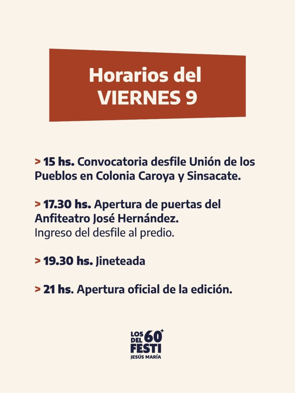 El festival dará comienzo efectivo el viernes 9 con el acto inaugural desde las 21 y la participación de Destino San Javier, más una grilla que incluye a Los Palmeras y Q’ Lokura entre los destacados del arranque. El Desfile Unión de los Pueblos será a las 15.30, con arribo al Anfiteatro José Hernández a las 17.30.
