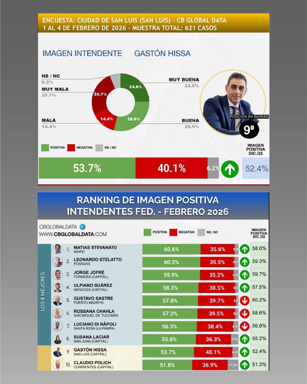 El intendente de la ciudad de San Luis, Gastón Hissa, se ubicó en el noveno puesto del ranking federal de intendentes elaborado por CB Consultora Opinión Pública en febrero de 2026, mejorando un lugar respecto al relevamiento de diciembre pasado, cuando había alcanzado la décima posición con un 52,2 % de imagen positiva.