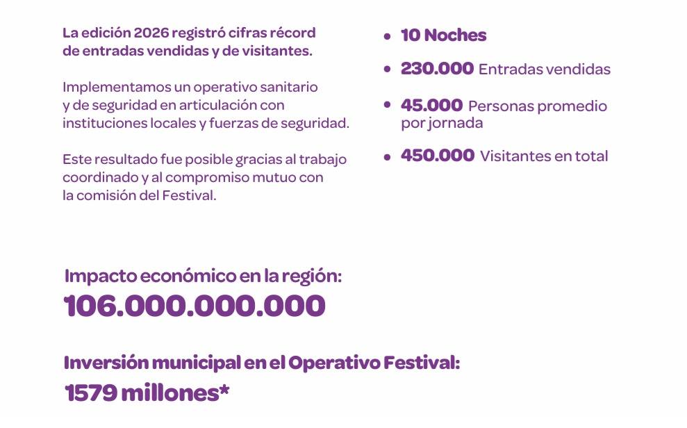 La Municipalidad de Jesús María presentó el informe correspondiente al Operativo Festival 2026, en el marco de la 60º edición del Festival Nacional de Doma y Folklore, que reunió a más de 450 mil personas a lo largo de diez jornadas y generó un movimiento económico de 106.000.000.000 de pesos.