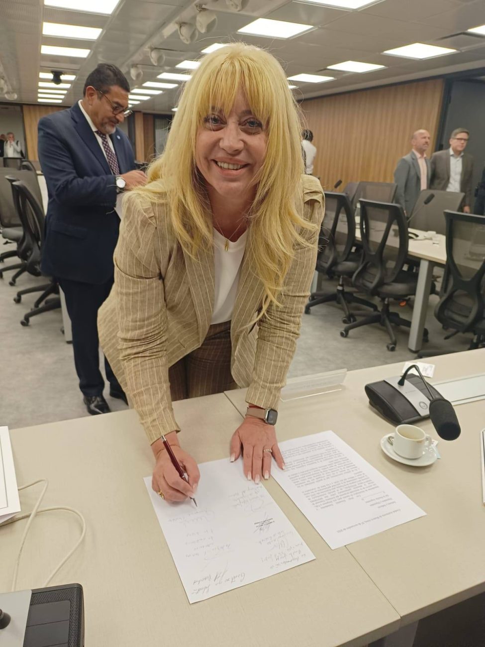 La intendenta de San Miguel de Tucumán, Rossana Chahla durante la firma del documento en la Cámara de diputados.