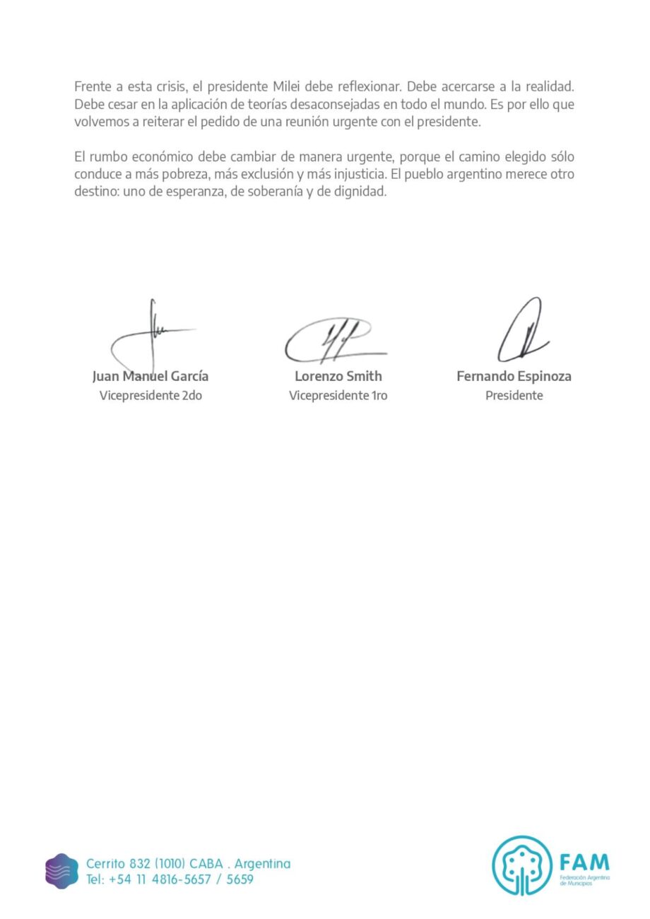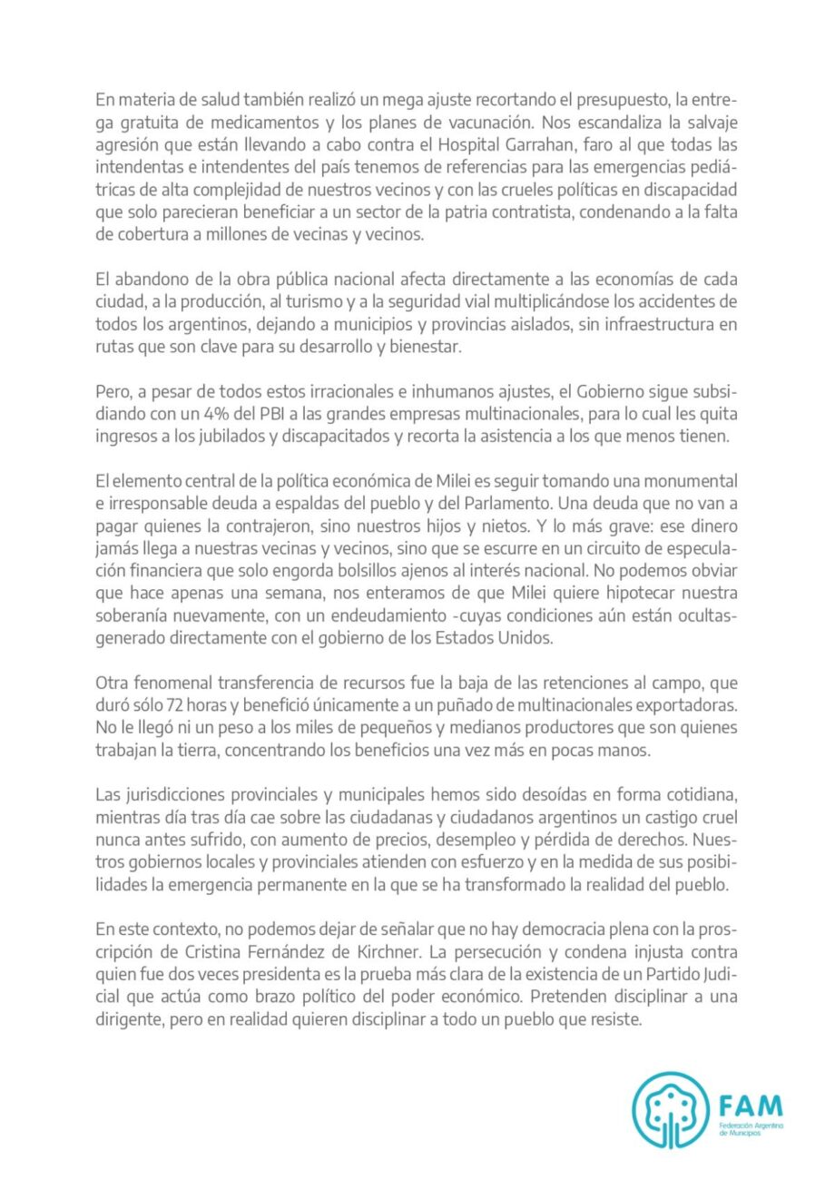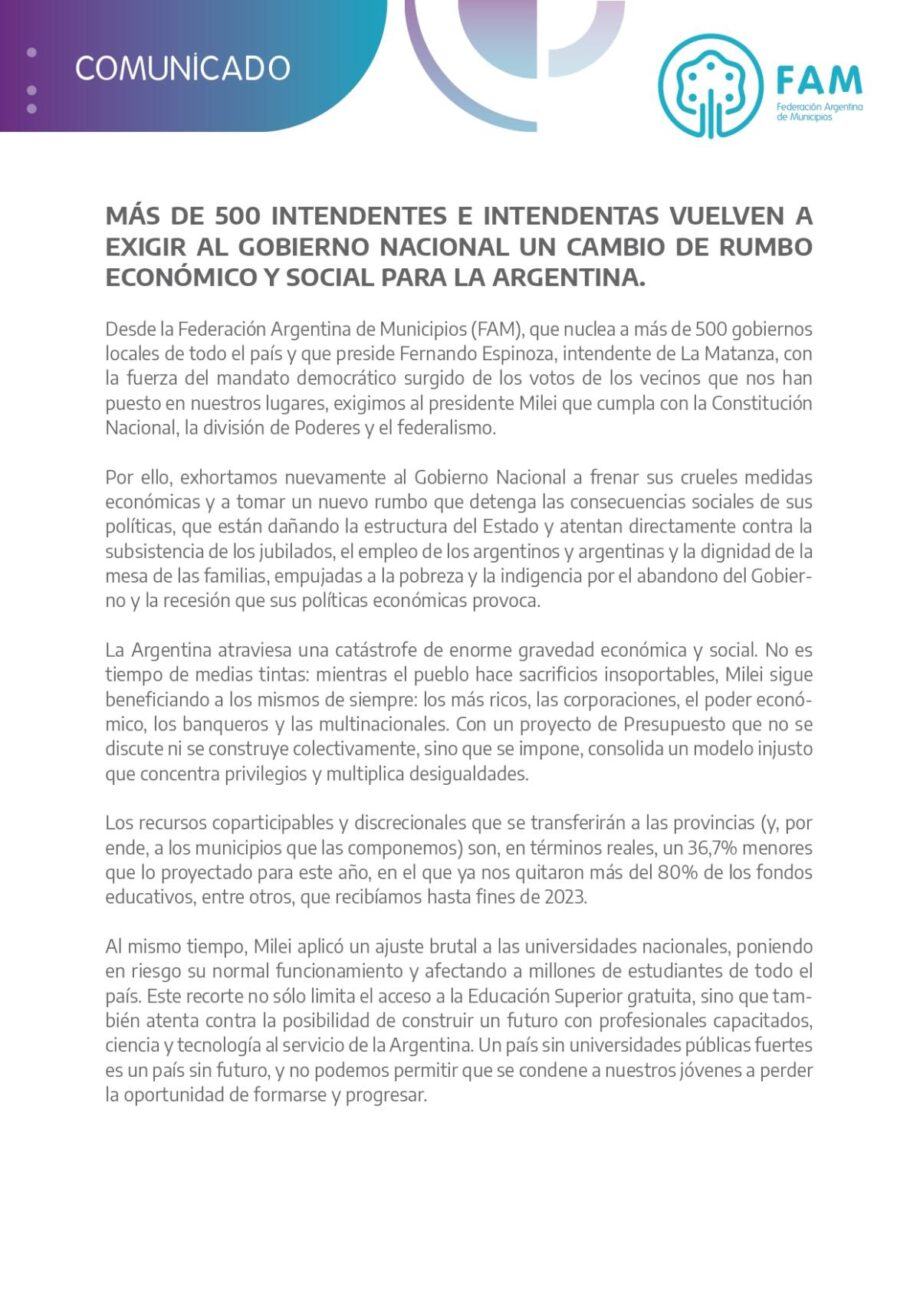 «Desde la Federación Argentina de Municipios (FAM), que nuclea a más de 500 gobiernos locales de todo el país y que preside Fernando Espinoza, intendente de La Matanza, con la fuerza del mandato democrático surgido de los votos de los vecinos que nos han puesto en nuestros lugares, exigimos al presidente Milei que cumpla con la Constitución Nacional, la división de Poderes y el federalismo» dice el comunicado.