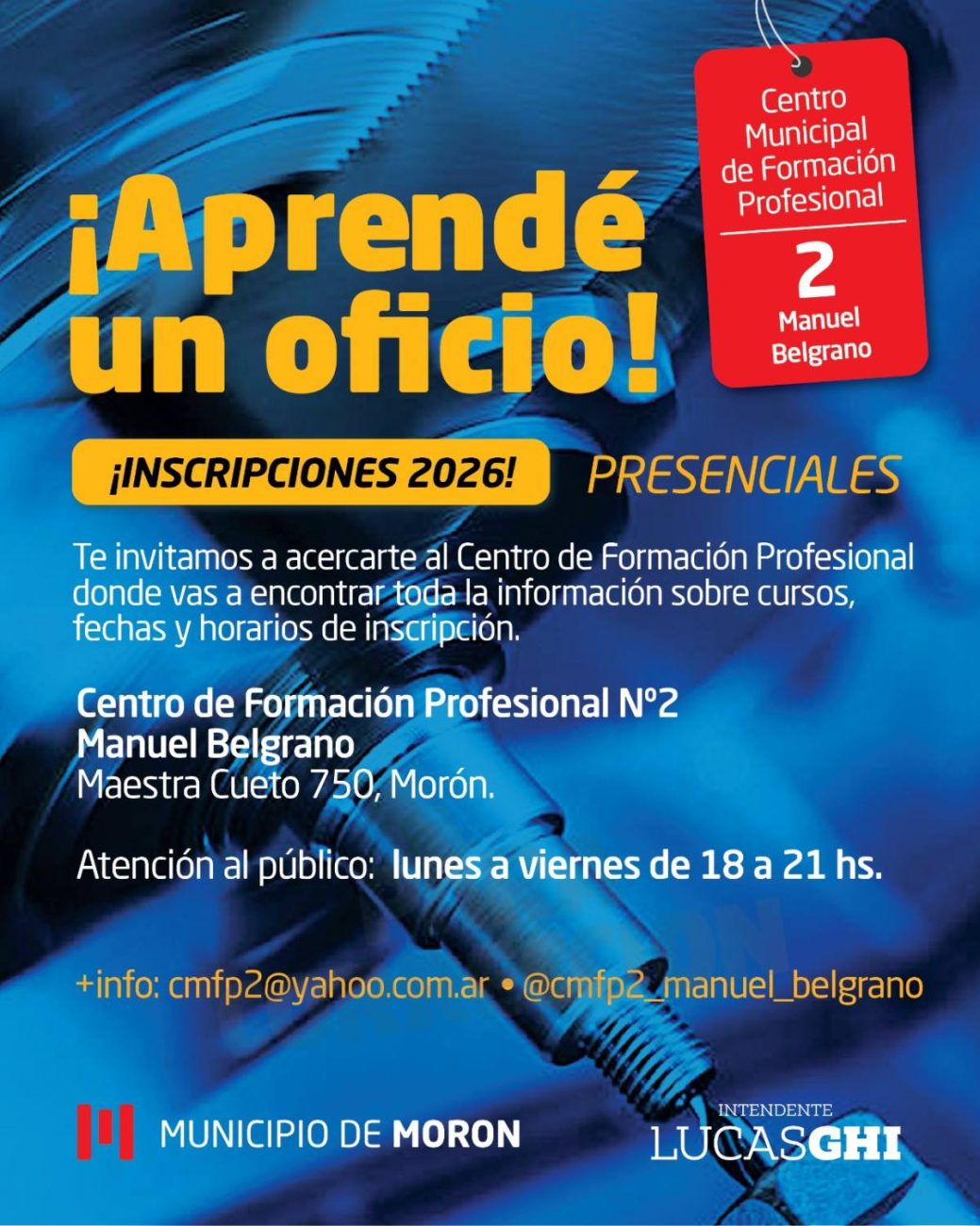 El Centro de Formación Profesional Nº2 “Manuel Belgrano” (Maestra Cueto 750, Morón) atiende de lunes a viernes de 18 a 21 hs. Sus vías de contacto son [email protected] o Instagram @cmfp2_manuel_belgrano.