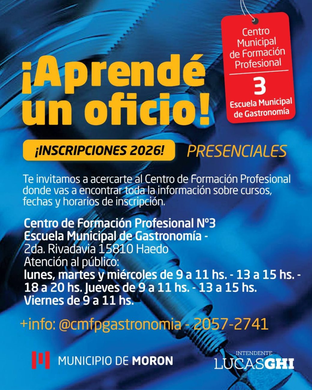 La Escuela Municipal de Gastronomía CFP Nº3 (2da Rivadavia 15810, Haedo) funciona los lunes, martes y miércoles de 9 a 11, de 13 a 15 y de 18 a 20 hs; los jueves de 9 a 11 y de 13 a 15 hs; y los viernes de 9 a 11 hs. Se pueden comunicar al 2057-2741 o por Instagram @cmfpgastronomia.