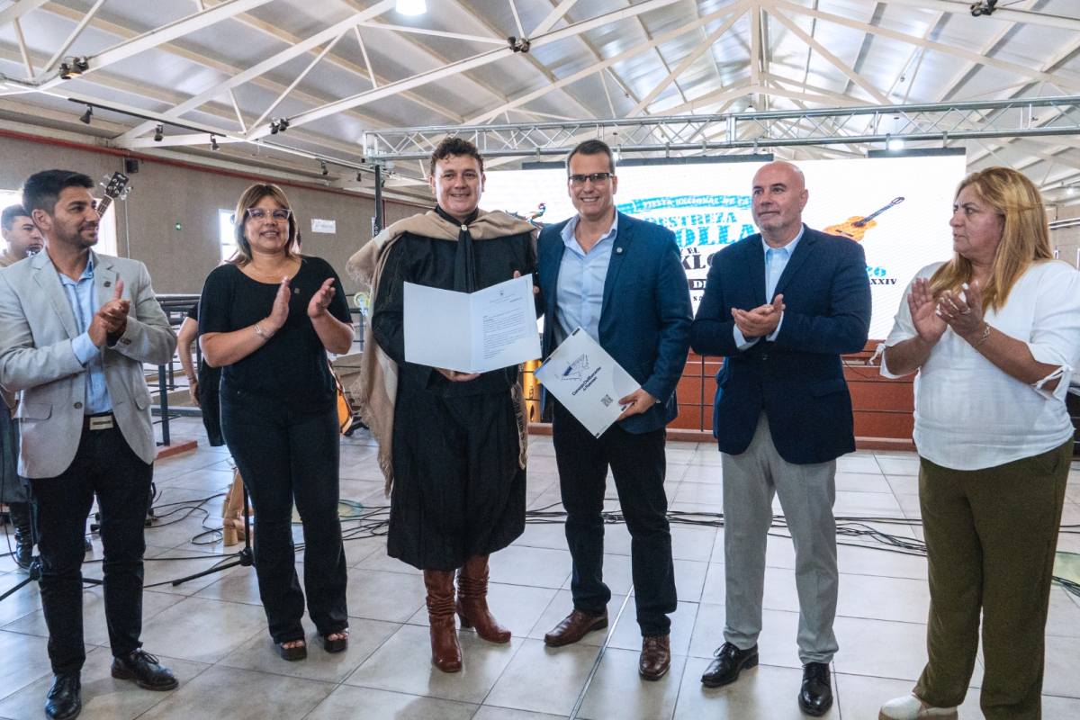 En ese marco, se realizó la entrega de la Declaración de Interés del Concejo Deliberante de Rawson a la cueca “Al Médano de Oro”, distinción otorgada por el intendente Carlos Munisaga junto al presidente del Concejo Deliberante y concejales presentes, y recibida por el propio Villegas.