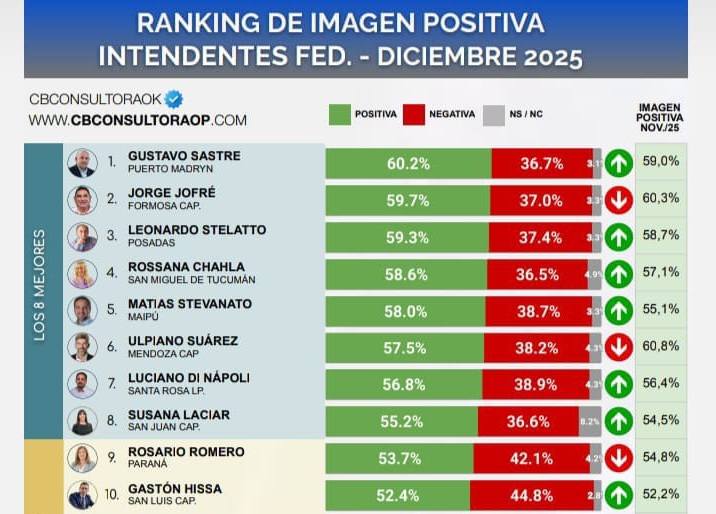 El porcentaje positivo representa una leve suba de 0,2 puntos respecto al mes anterior (cuando marcó 54,5%), lo que indica que la jefa comunal sanjuanina consolida su presencia entre los intendentes con mayor aprobación del país, en un escenario político atravesado por fuertes tensiones y demandas ciudadanas.