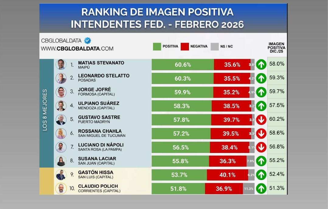 La intendenta de la ciudad de San Juan, Susana Laciar, mantuvo su performance en el ranking federal de intendentes elaborado por CB Consultora Opinión Pública, alcanzando un 55,8 % de imagen positiva en la medición de febrero de 2026. El estudio, realizado entre el 1 y el 4 de febrero en capitales y ciudades de todo el país, muestra además un crecimiento de casi 8 puntos respecto a la encuesta anterior.
