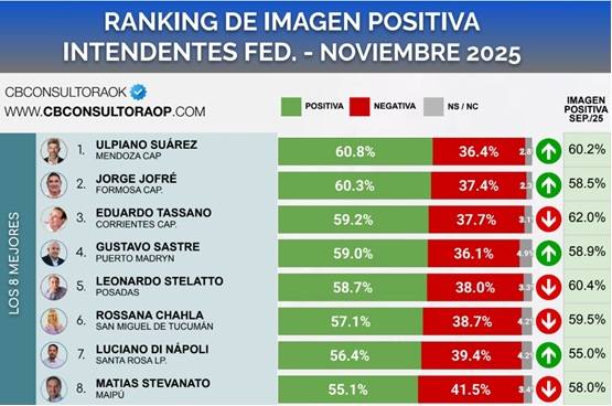 El intendente de la Ciudad de Mendoza, Ulpiano Suarez, fue reconocido una vez más por su destacada gestión al ubicarse en el primer lugar del Ranking Federal de Intendentes que elabora mensualmente CB Consultora Opinión Pública. En el relevamiento correspondiente a noviembre, el mandatario capitalino obtuvo un 60,8% de imagen positiva, resultado que refleja la aprobación ciudadana hacia una administración cercana, moderna y orientada al bienestar de los vecinos.