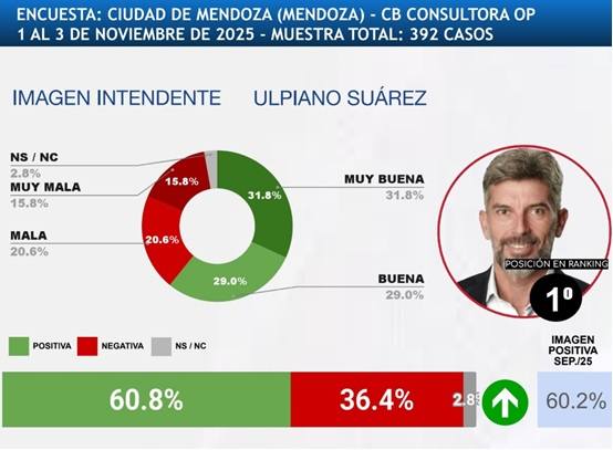 El estudio, realizado entre el 1 y el 3 de noviembre de 2025 sobre una muestra de 392 casos en la Ciudad de Mendoza, reveló que un 31,8% calificó su imagen como “muy buena” y un 29% como “buena”. Este resultado posiciona a Ulpiano Suarez como el intendente con mayor valoración positiva del país, en un mes atravesado por el contexto pos electoral.